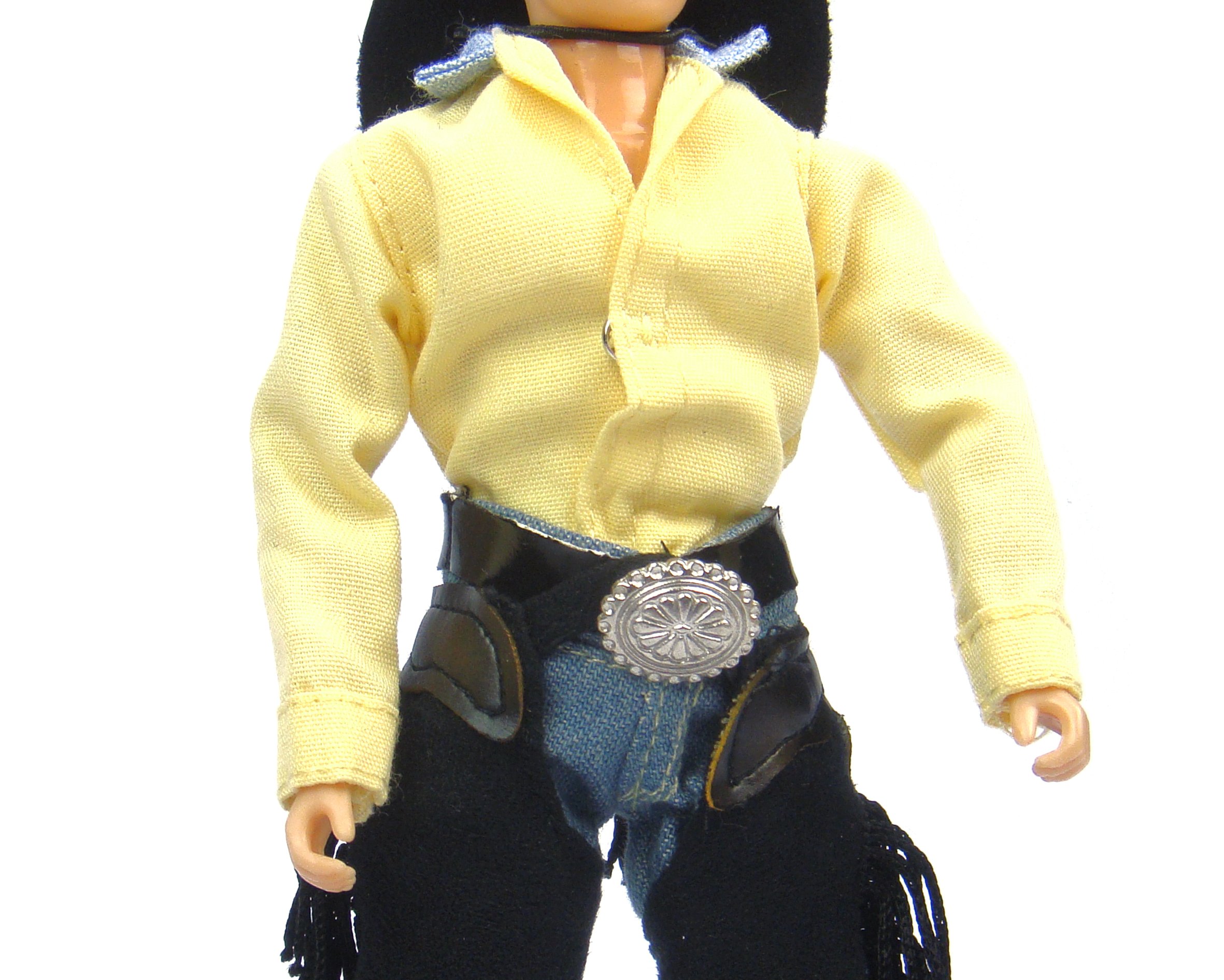 - Comes dressed in jeans with black chaps, black cowboy hat, boots and yellow shirt