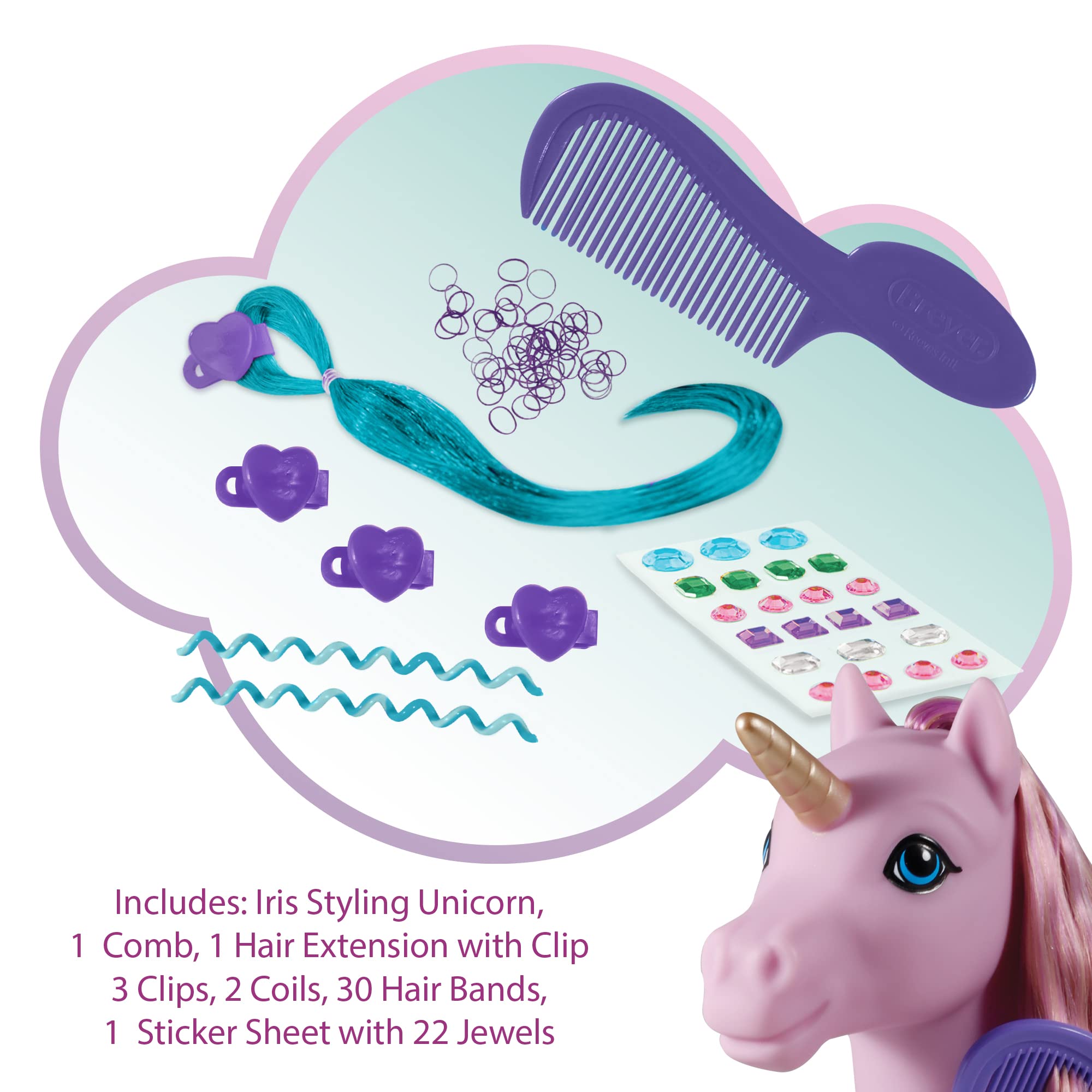 - INCLUDES: Iris Styling Unicorn, 1 Comb, 1 Hair Extension with Clip, 3 Clips, 2 Coils, 30 Hair Bands, 1 Sticker Sheet with 22 Jewels
