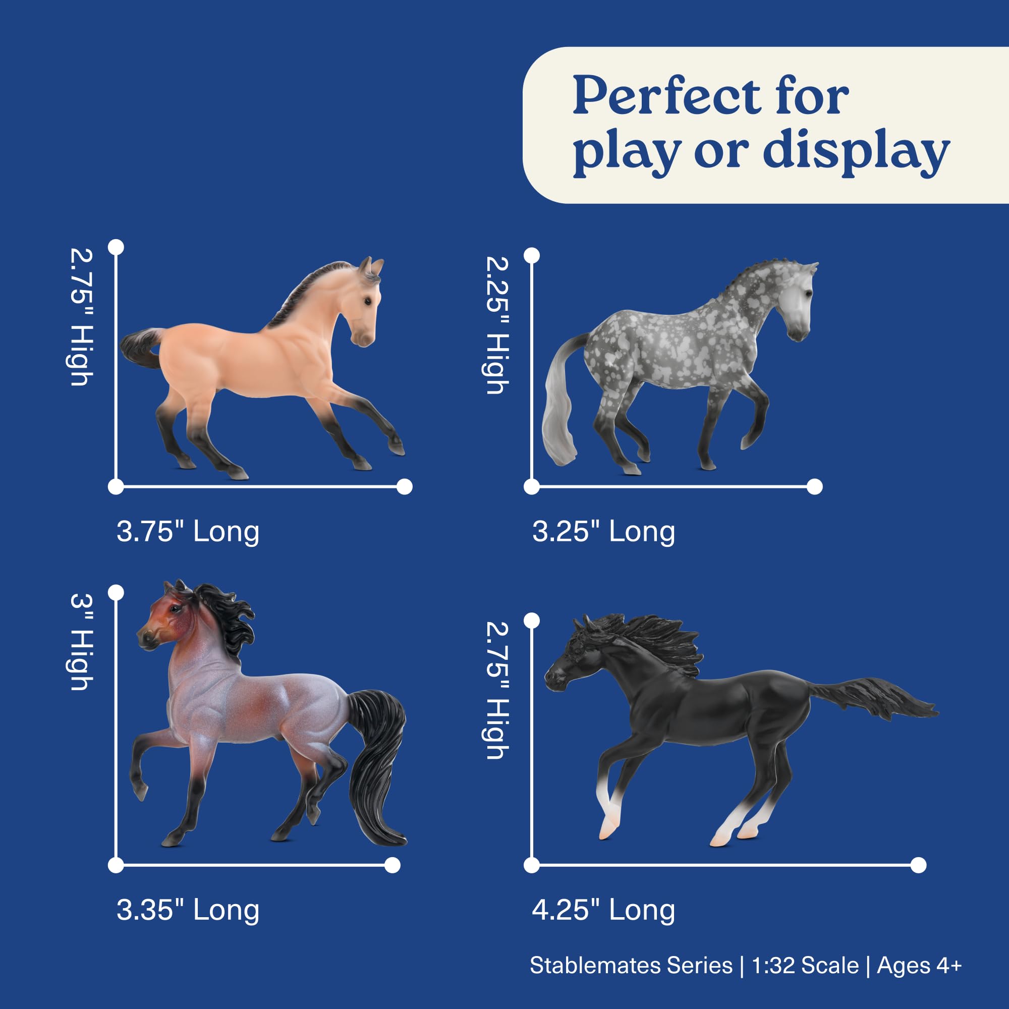 - PRODUCT SPECIFICATIONS: Package contains (4) Breyer Stablemates Horses. Stablemates 1: 32 Scale. Measures approximately 3.75" L x 2.5" H. Set includes the following breeds: Bay Roan Morgan Cross, Dunskin American Warmblood, Black Mustang, Dapple Grey Hanoverian. Recommended for ages 4 years and older.